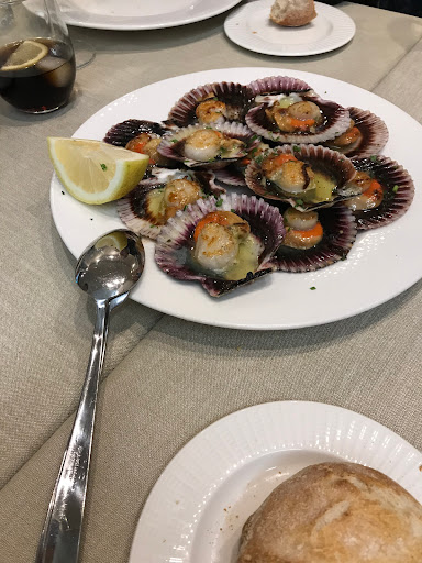 Pedí media ración de Zamburiñas y estaban riquísimas además de tener buen tamaño. Con la bebida te ponen de tapa, tortilla de patata y estaba fantástica, en su punto ni muy hecha ni líquida. Las almejas también media ración y buen tamaño y muy ricas con una salsa de tomate natural. Lo único un poco de calor en el local. Por lo demás muy recomendable
